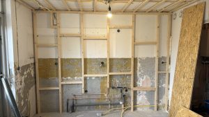 Om te zorgen dat alle leidingen en kabels achter de keukenmuur konden lopen heb ik een stevige voorzetwand gemaakt waar alsnog de keukenkasten aan kunnen hangen.