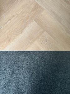 Goede materialen maken een mooie afwerking. Deze visgraat PVC loopt strak over op de droogloopmat.